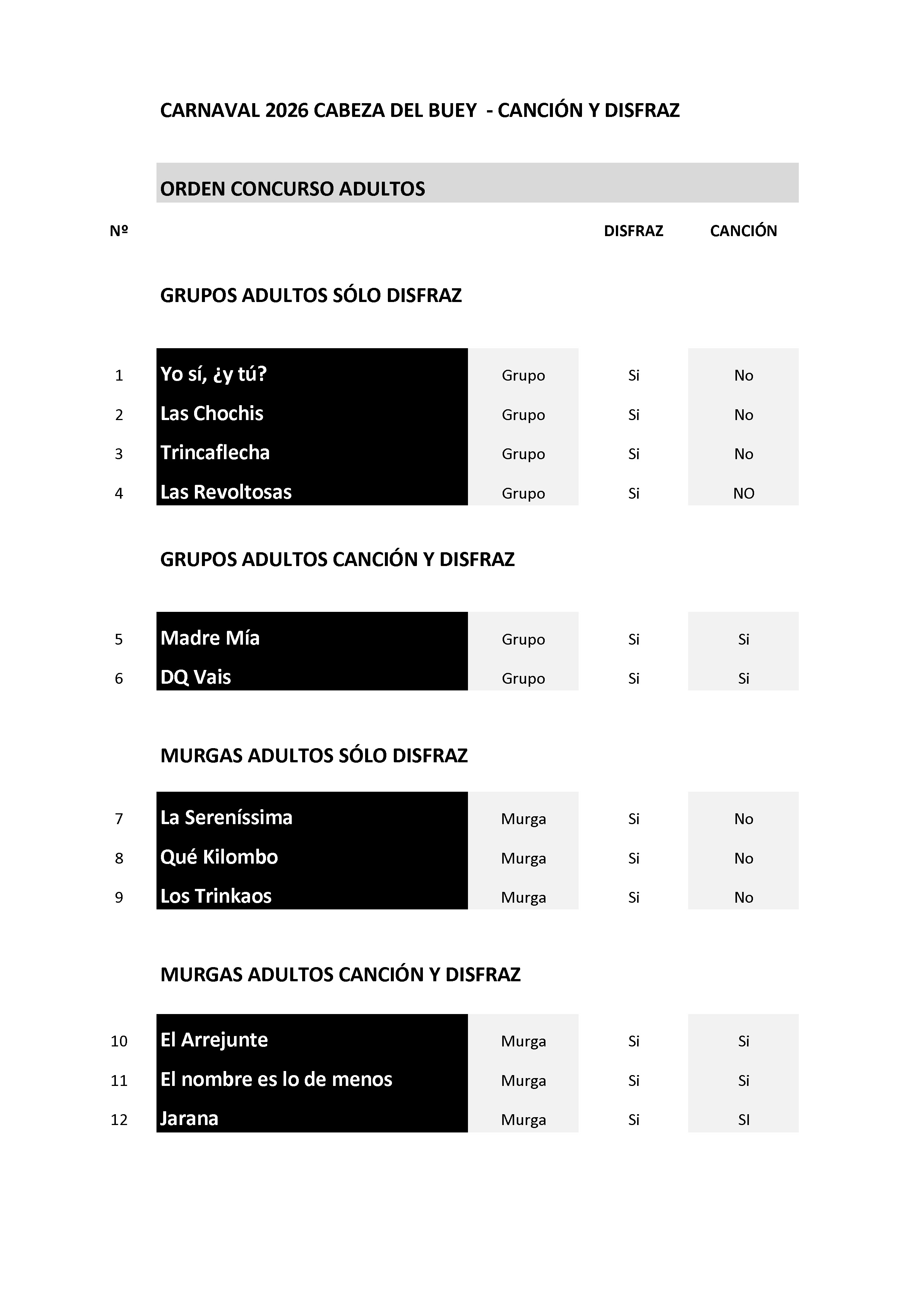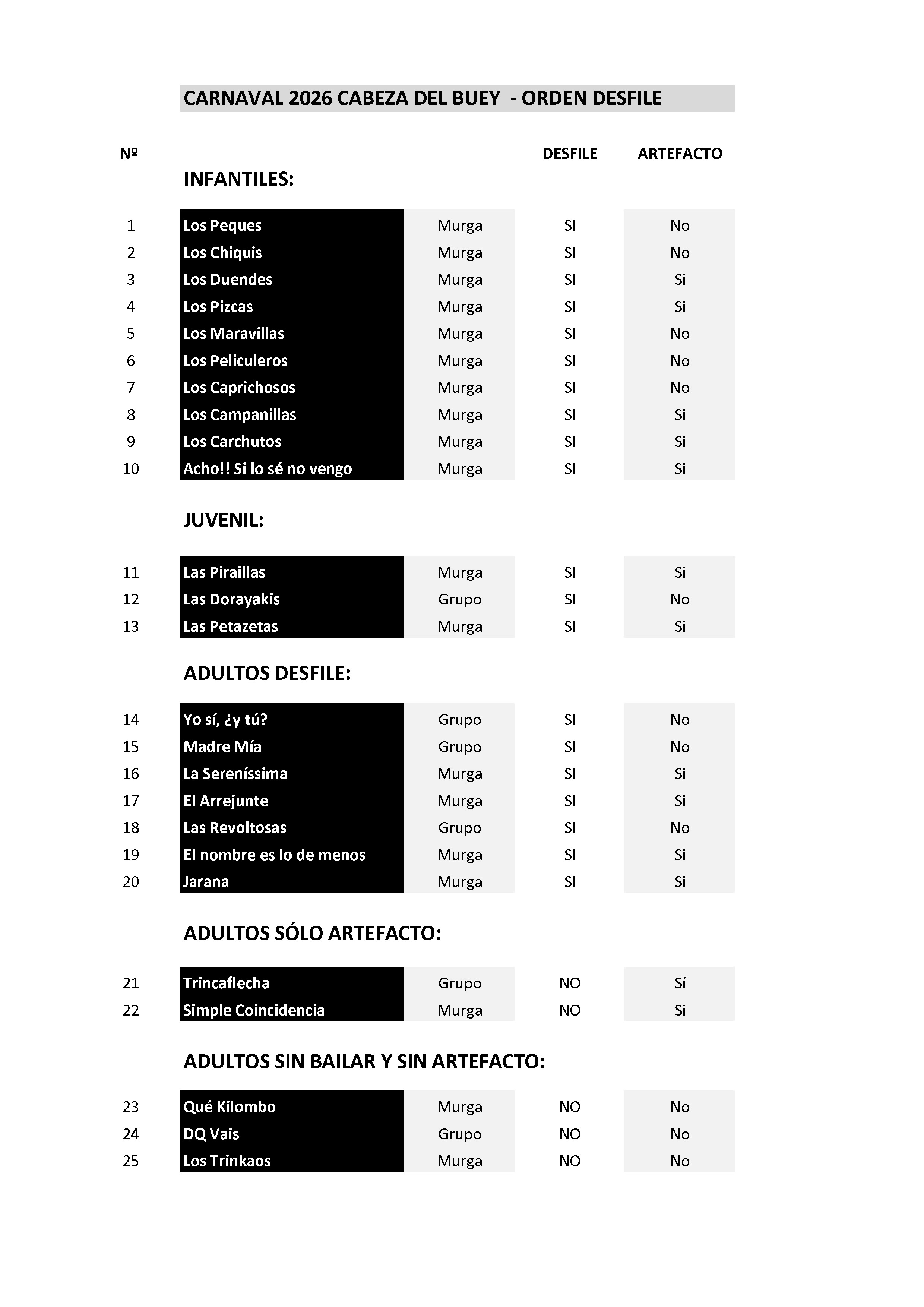 CARNAVAL 2026. Orden del desfile y Concursos